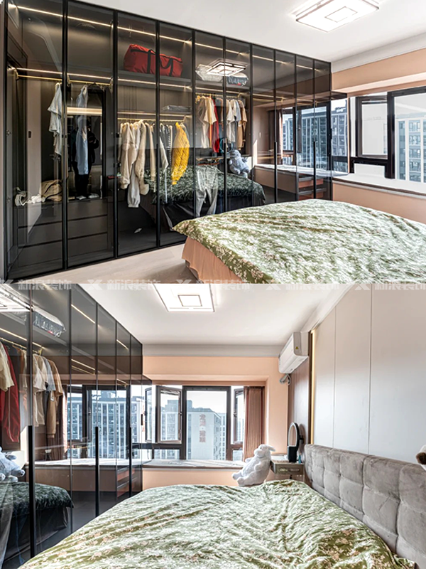 主臥拆除原吊頂增加層高,利用玻璃門擴(kuò)大整體空間視覺效果。